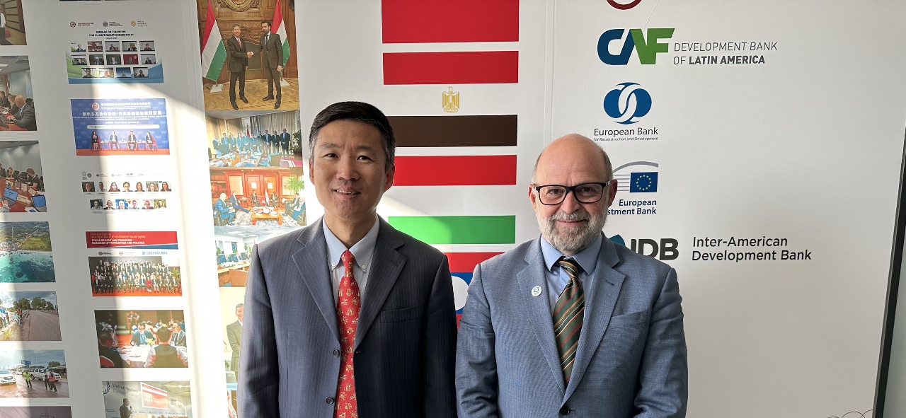 Multilateral Cooperation Center for Development Finance (MCDF) CEO Wang Zhongjing hosted a bilateral meeting with Global Environment Facility (GEF) CEO and Chairperson Carlos Manuel Rodriguez and staff at the MCDF Secretariat in Beijing on 9 November.